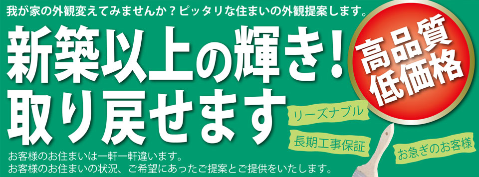 ここまでご覧頂きありがとうございます。 最初はきれいでピカピカだった大切なマイホームも時とともに色褪せや雨染み、コケやカビが目立ってきます。 「そろそろ塗り替えの時期かな?」「どこに頼めば良いのかな?」「金額はいくらかかるのかな?」 といった不安や悩みはみなさん共通で誰もが思うことです。 ここで一つお約束したい事があります。 私たちは、そんなみなさんの不安や悩みを解決し 「必ずご満足いただける塗装工事」をご提供致します。 頂いた一本の電話、一通の電子メールからのご縁を多雪にし お客様のご要望をお聞きし、最適なプランをたて、プロとしてのアドバイスを加味し ご納得頂ける内容の塗装工事を、ご納得頂ける金額で提供致します!